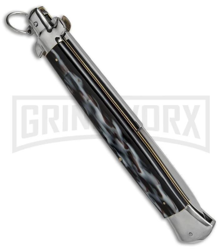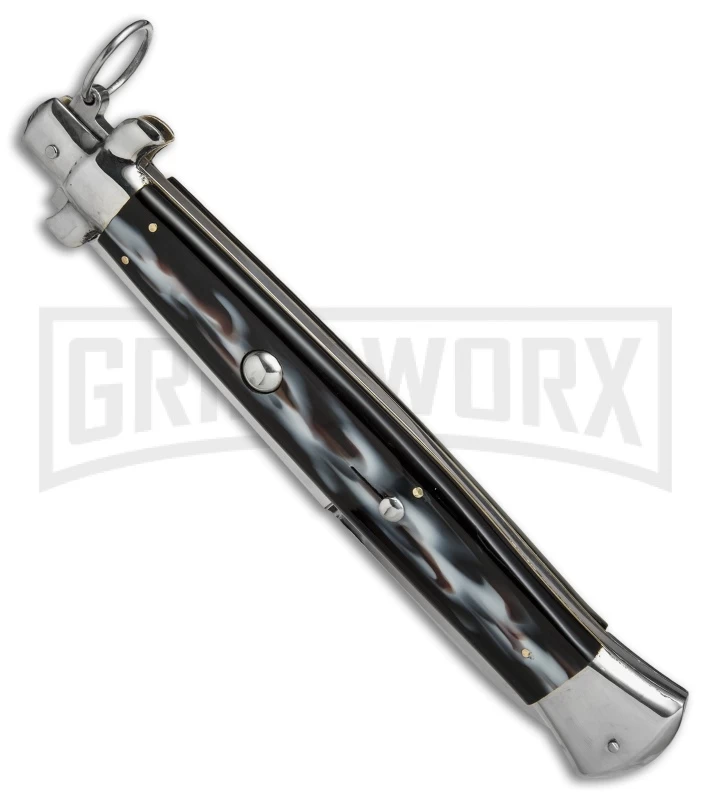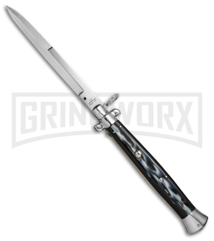 Be the first to review “A.G.A. Campolin 18″ Italian Stiletto Sim Dark Horn Ring Pull Auto Knife – Bayo” Cancel reply