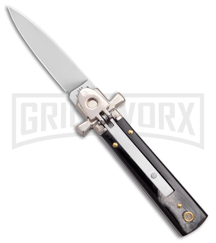 The AGA Campolin Dominus Leverlock features an Italian made design with beautiful workmanship and style. Leverlock stilettos offer easy operation, just press the lever down and the knife snaps opens automatically! Then press the lever again to release the blade. This lever lock model features wood scales, stainless bolsters, and a satin stainless steel blade.