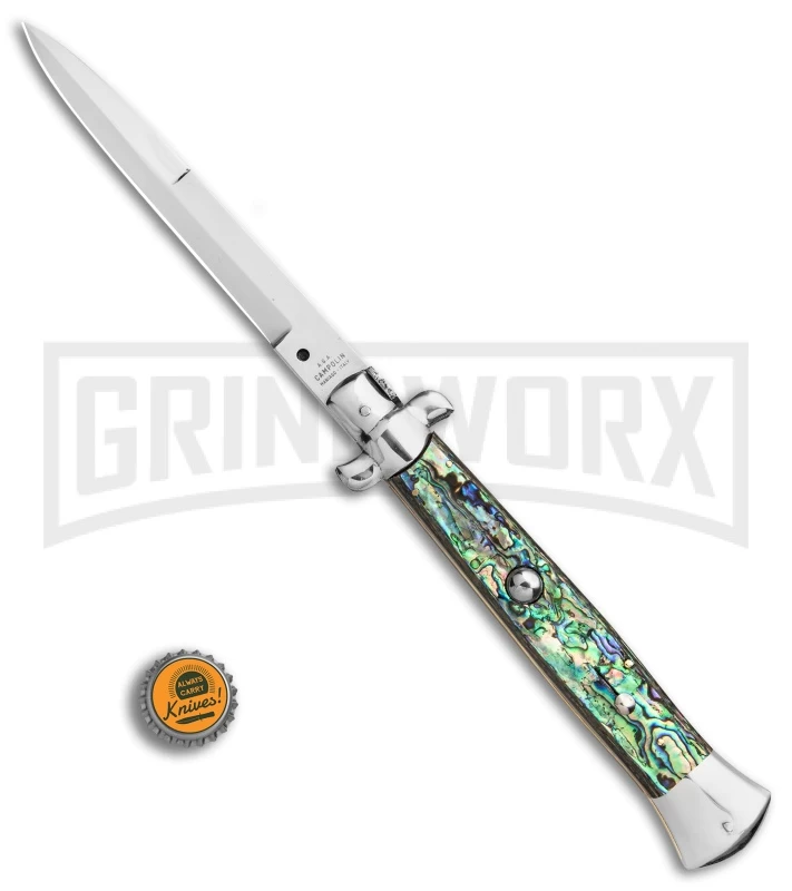 More sword than knife, this 15″ stiletto is an impressive sight to behold. The polished, stainless steel bayonet blade is 6.6″ long and releases in a flash with the push button on the front of the handle. Despite the size, the action on this knife is smooth and the lock up is solid. The abalone handles are sleek and comfortable in the hand. The nickel silver bolsters and buttons are offset by the brass pins and liners. The blade tang is stamped “AGA Campolin Made in Italy.” This is a magnificent addition to your Italian collection, and one that is sure to attract a great deal of attention.