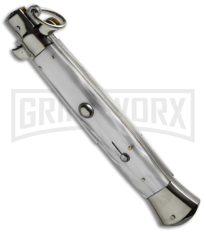 More sword than knife, this 15″ stiletto is an impressive sight to behold. The polished, stainless steel bayonet blade is 7″ long and releases in a flash with the push button on the front of the handle. Despite the size, the action on this knife is smooth and the lock up is solid. The white acrylic handles are sleek and comfortable in the hand. The nickel silver bolsters and buttons are offset by the brass pins and liners. The blade tang is stamped “AGA Campolin” on one side and “Made in Italy” on the other. This is a magnificent addition to your Italian collection, and one that is sure to attract a great deal of attention.