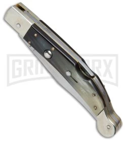 This beautiful 9″ AGA Campolin Sahara Stiletto features a stainless steel clip point blade with polished nickel silver bolsters. The rustic dark horn scales are offset with brass pins over brass liners. The nickel silver round push button and sliding safety give this stiletto even more class. This knife shows the highest quality workmanship and will make an elegant addition to your Italian collection.