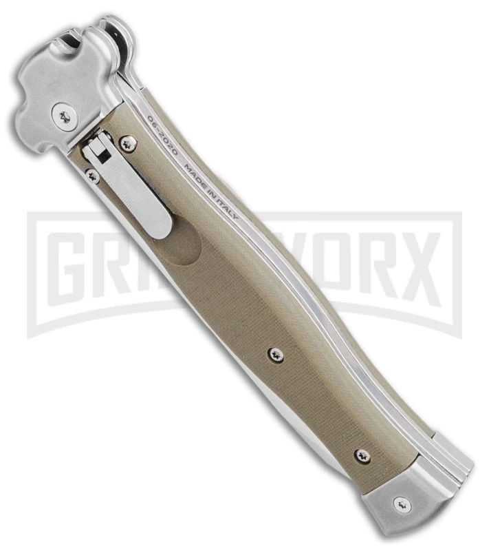 AGA Campolin really hit this one out of the park with a flawless fit and finish, snappy automatic deployment, and rock solid blade lock up. The blade is made from Austrian N690co steel with a plain edge and a satin finish. Item includes a tip-down pocket clip.